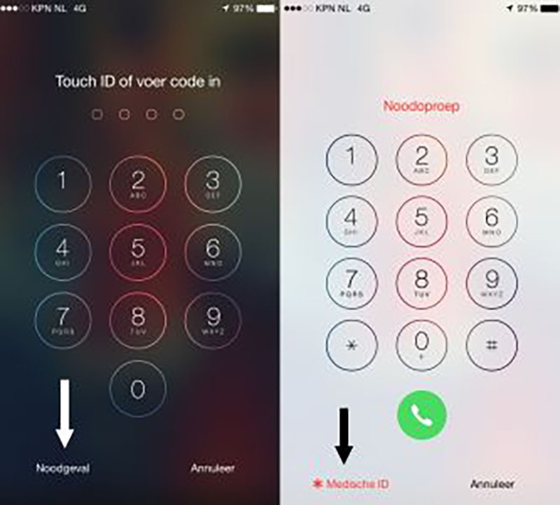 Bij een vergrendeld scherm zie je links onderin “Noodgeval”. Je klikt erop en dan krijg je, links onderin, “Medische ID” te zien. Klik hierop en dan worden de gegevens, welke je hebt ingevoerd, zichtbaar en zo kunnen de hulpdiensten de gegevens zien en weten zij wie ze moeten bellen!